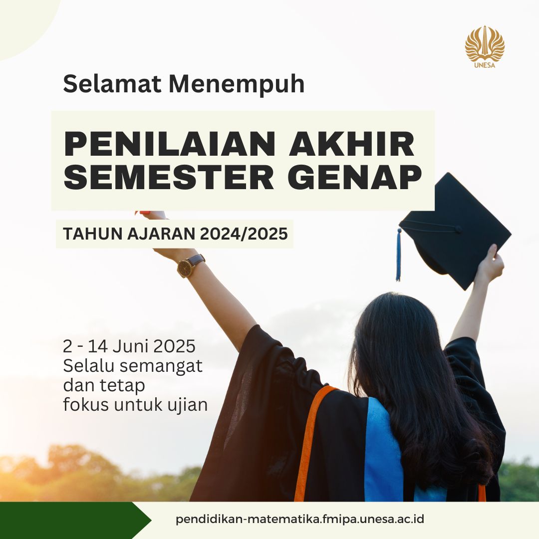 Surabaya, 21 Mei 2025. Penilaian Akhir Semester Genap Prodi Pendidikan Matematika Tahun Akademik 2024-2025 dilaksanakan tanggal 2-13 Juni 2025. Silahkan mendownload pada link berikut: